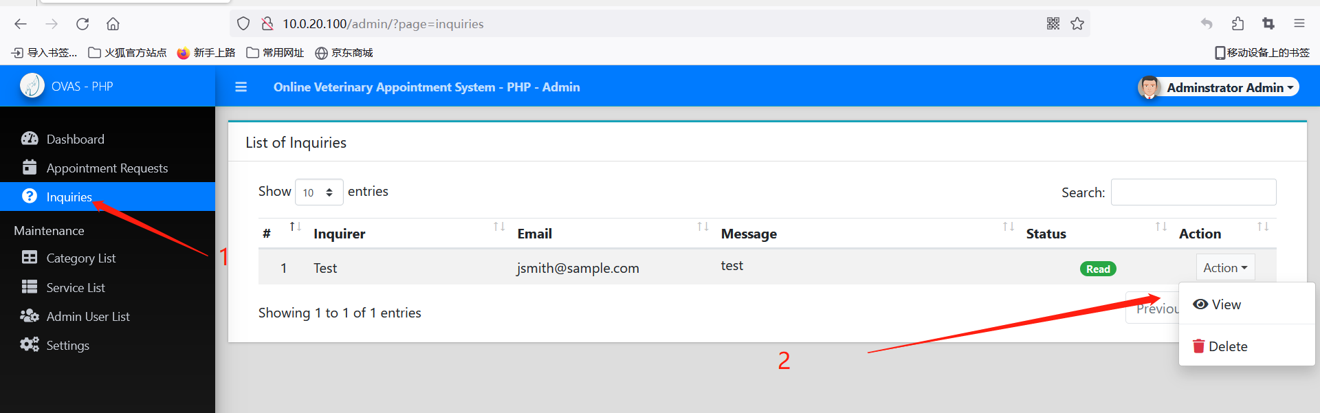 该OVAS CMS后台存在SQL注入,在此后台页面点击Inquiries–>Action–>View使用BP抓取到数据包且保存到本地文件中