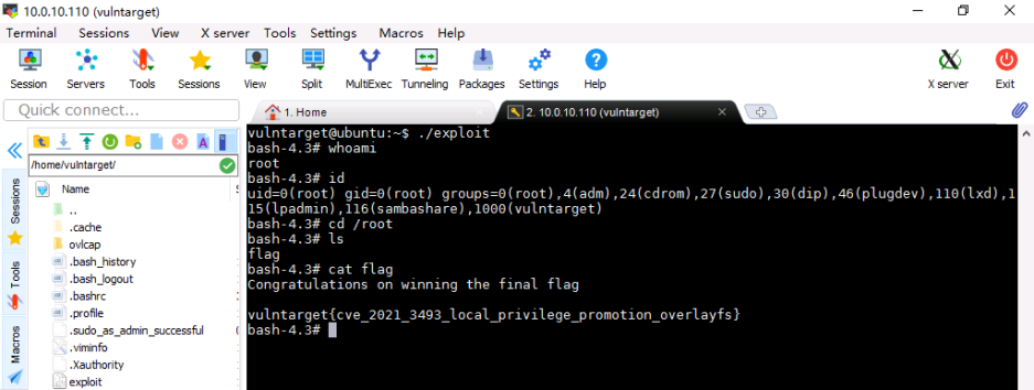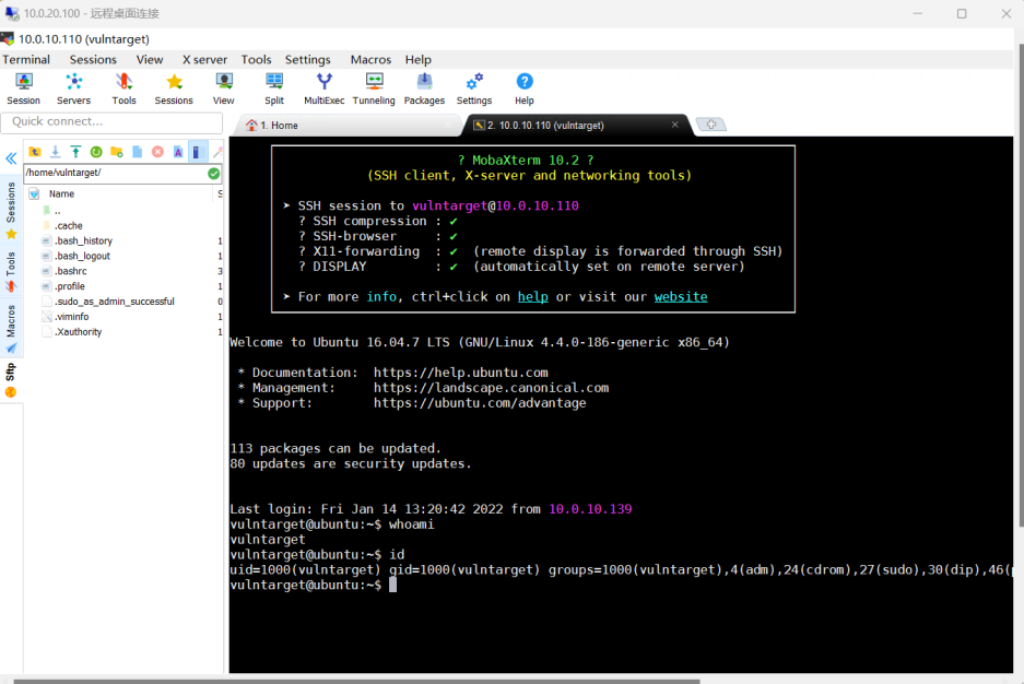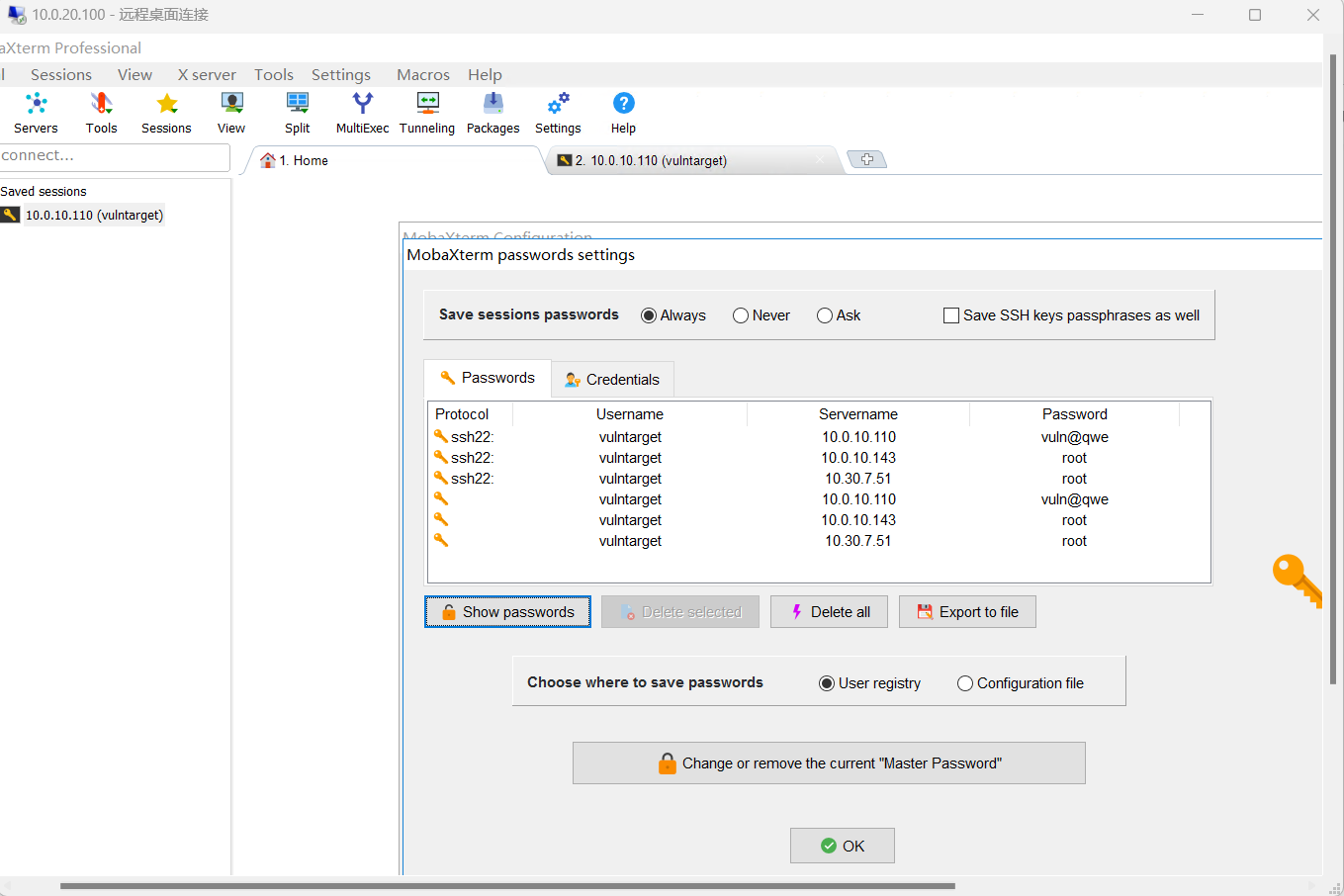在下方看到MobaXterm打开后需要输入密码使用本机管理员密码登录成功,且存在一Linux主机为上面扫描出来的内网机器,点开后为vulntarget普通用户登录。