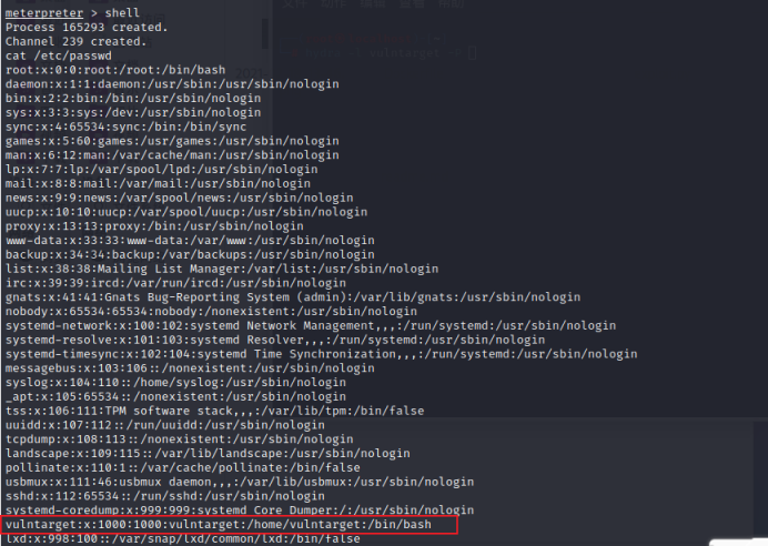 查看/home目录下用户有哪些。发现存在vulntarget用户尝试使用Hydra进行SSH爆破,获得密码root
