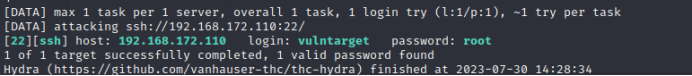 1 hydra -l vulntarget -P passwd.txt 192.168.172.110 ssh