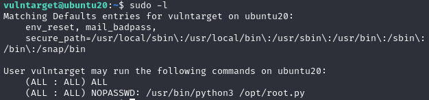 成功获取到10.0.10.110中的用户vulntarget的密码为vuln@qwe,利用sudo进行提权