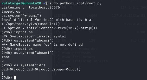 查看/opt/root.py文件内容。运行脚本会在本地的1025-65535端口上开启一个socket接口且密码是mortals登录成功后根据选项给出响应的回显如果有错误的输入在异常处理处打印异常且调用pdb模块,同时进入到调式模块下在此模块中可导入OS模块来执行系统命令完成提权。