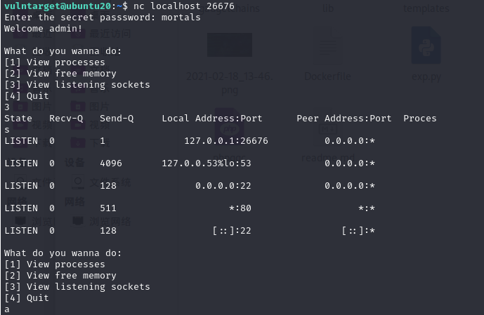 1 2 3 4 5 6 7 8 9 10 11 12 13 14 15 16 17 18 19 20 21 22 23 24 25 26 27 28 29 30 31 32 33 34 35 36 37 38 39 40 41 42 import socketimport randomimport subprocessimport pdb port = random.randint(1025 , 65535 ) try : sock = socket.socket(socket.AF_INET, socket.SOCK_STREAM) sock.setsockopt(socket.SOL_SOCKET, socket.SO_REUSEADDR, 1 ) sock.bind(('127.0.0.1' , port)) sock.listen(1 ) print (f'Listening on localhost:{port} ' ) (clientsock, addr) = sock.accept() clientsock.send(b'Enter the secret passsword: ' ) if clientsock.recv(1024 ).strip().decode() != 'mortals' : clientsock.send(b'Wrong password!\n' ) else : clientsock.send(b'Welcome admin!\n' ) while True : clientsock.send(b'\nWhat do you wanna do: \n' ) clientsock.send(b'[1] View processes\n' ) clientsock.send(b'[2] View free memory\n' ) clientsock.send(b'[3] View listening sockets\n' ) clientsock.send(b'[4] Quit\n' ) option = int (clientsock.recv(1024 ).strip()) if option == 1 : clientsock.send(subprocess.getoutput('ps aux' ).encode()) elif option == 2 : clientsock.send(subprocess.getoutput('df' ).encode()) elif option == 3 : clientsock.send(subprocess.getoutput('ss -lnt' ).encode()) elif option == 4 : clientsock.send(b'Bye\n' ) break except Exception as e: print (e) pdb.post_mortem(e.__traceback__)finally : quit()
