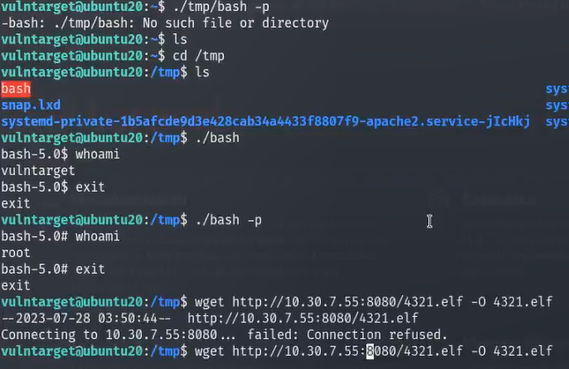 还有另外一种方法,这里把bin/bash复制到一个临时文件夹下,然后再给权限,执行,同样也可以提权。