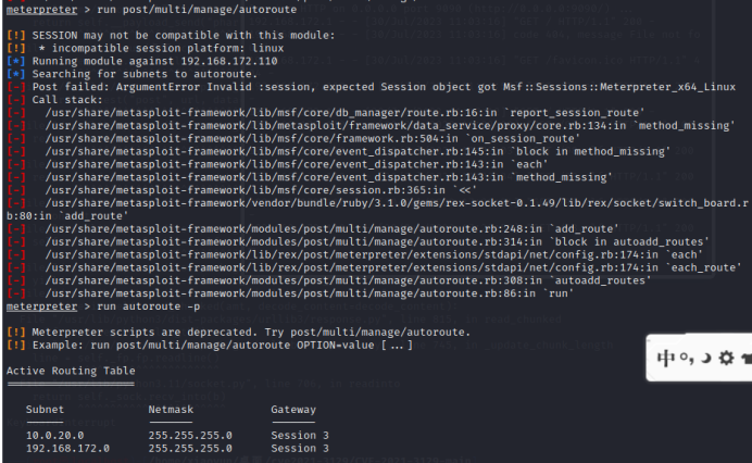 1 2 meterpreter> run post/multi/manage/autoroute meterpreter> run autoroute -p