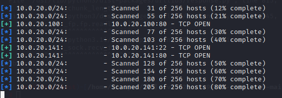 1 2 3 4 5 use auxiliary/scanner/portscan/tcp set rhost 10.0.20.0/24 set ports 21,22,80,135,139,445,8080 set threads 30 run