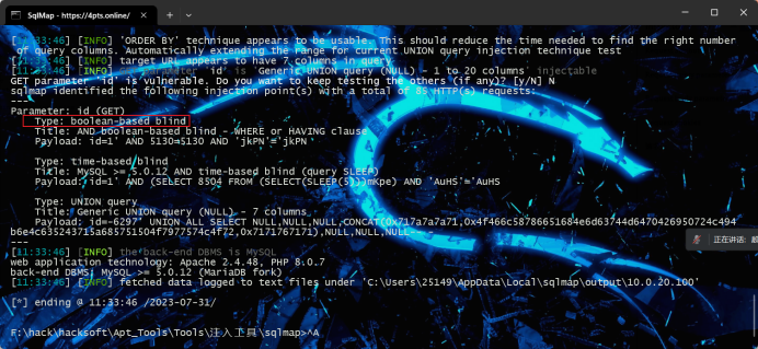 使用SQLMAP对其抓取的HTTP请求包进行SQL注入测试,发现存在SQL注入
