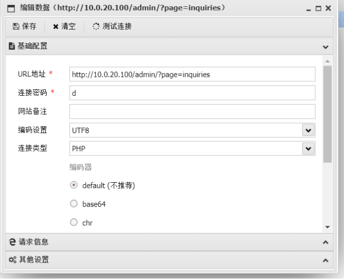 一开始木马地址没搞对,怎么都连不上,我直接把马子写进index页里,然后连。