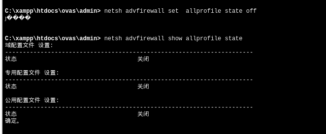 1 2 netsh advfirewall show allprofile state //查看防火墙状态 netsh advfirewall set allprofile state off //关闭防火墙