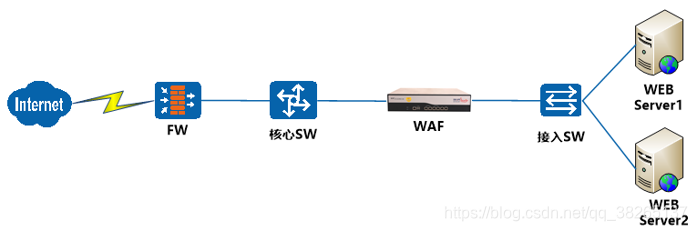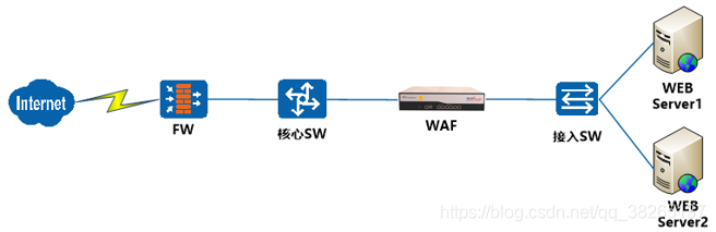 WAF采用反向代理模式以旁路的方式接入到网络环境中,需要在核心交换机上做策略路由PBR,将客户端访问服务器的流量牵引到WAF上,策略路由的下一跳地址为WAF的业务口地址。