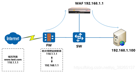 WAF采用反向代理模式以旁路的方式接入到网络环境中,需要更改网络防火墙的目的映射表,网络防火墙映射WAF的业务口地址,将服务器的IP地址进行隐藏。