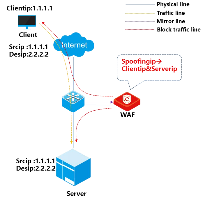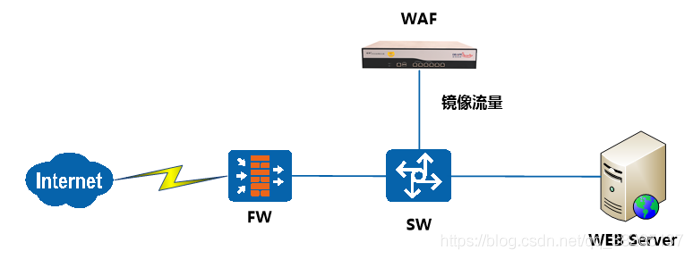 此拓扑适用于 WAF 旁路镜像阻断模式,WAF 旁路接入到交换机上,接收交换机传给 WAF 的镜像数据,对镜像数据进行分析,然后针对攻击行为进行构造阻断包,中断后续会话,进行攻击行为阻断。对存在的攻击以日志形式展示出来。拓扑如下: